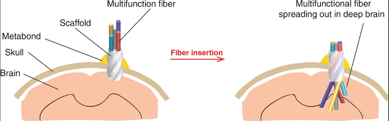 图28. 可膨胀的纤维电极植入大脑的过程示意图。