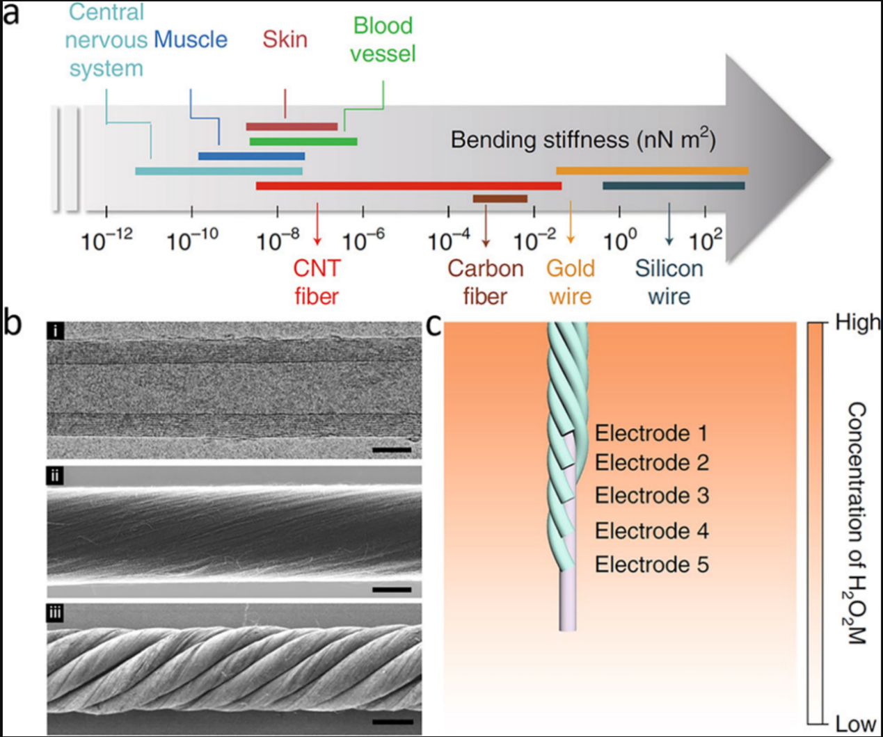 图31. a)不同软组织与碳纳米管纤维的弯曲刚度比较示意图;b)多壁碳纳米管的TEM和SEM照片;c)用于测试H2O2的五个纤维状传感器的缠绕组装。