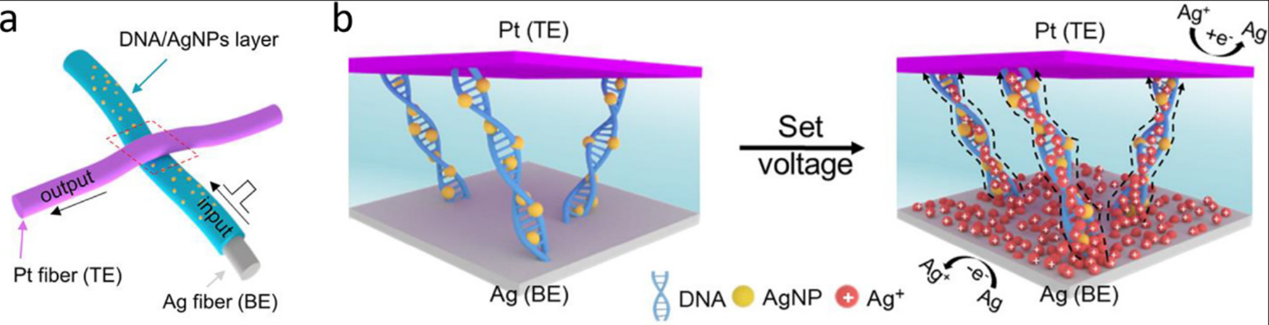图33. a)DNA桥接的纤维状忆阻器的设计示意图;b)忆阻器开关过程的机理。
