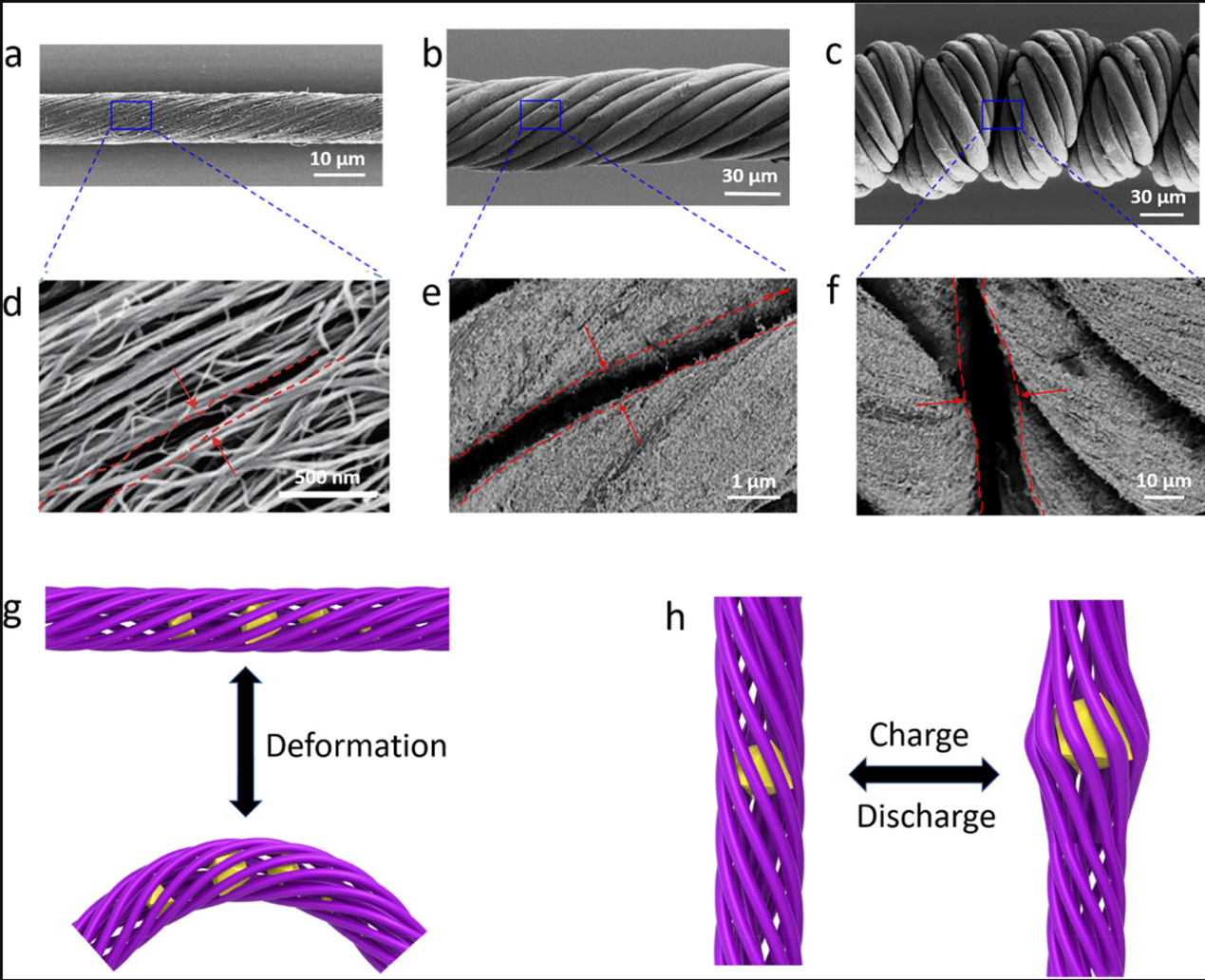图5.a-f)多尺度组装制备的螺旋纤维电极以及纤维内部多尺度孔隙的SEM照片;g-h)螺旋纤维电极稳定活性材料的示意图。