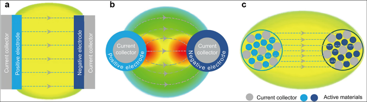 图6. 平面器件、纤维器件以及具有多孔道纤维电极之间的电场分布示意图。