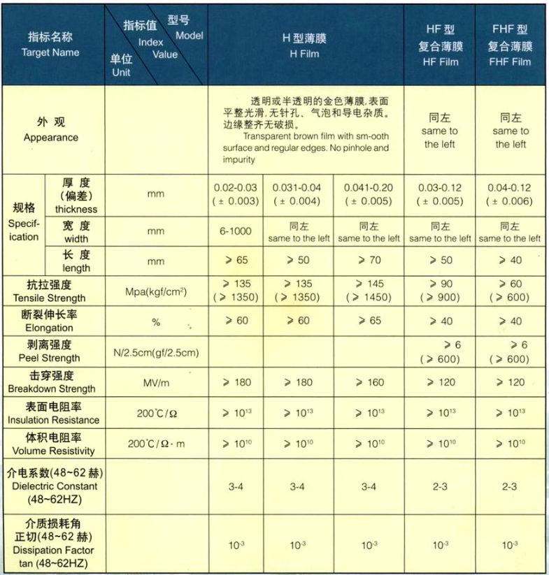 图2 F型PI薄膜技术参数(图片来源:江苏亚宝绝缘材料股份有限公司产品介绍)