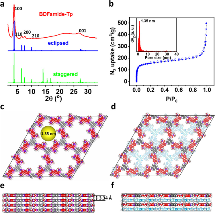 (c,e)BDFamide-Tp COF重合构象模型俯视(c)和侧视图(e)。