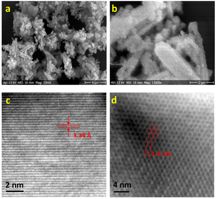 (c, d)溶剂热合成BDFamide-Tp COF的高分辨透射电子显微镜图。© 2022 The Authors