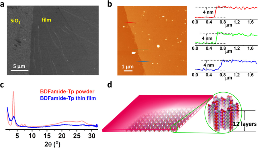 图5 (a)界面法合成的BDFamide-Tp COF薄膜的扫描电子显微镜图。