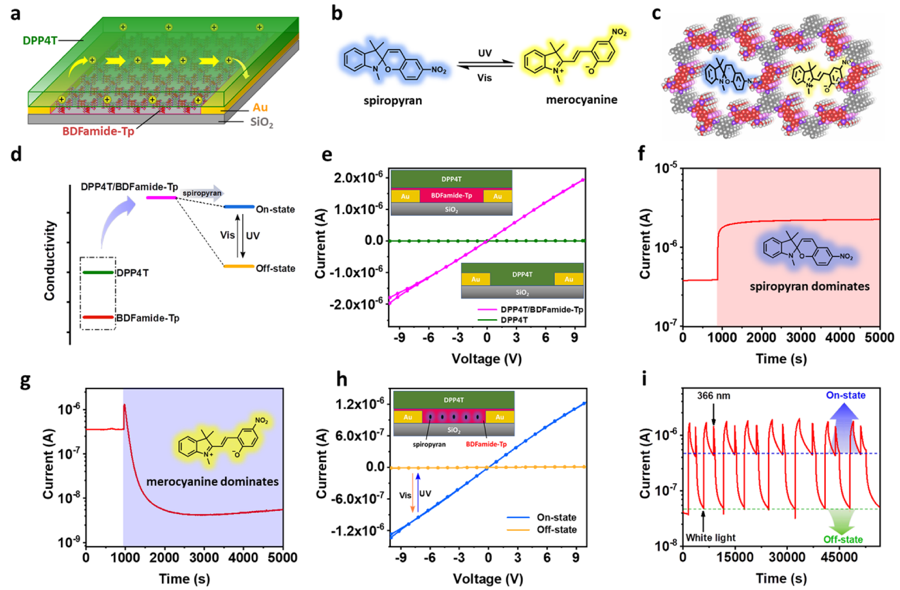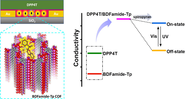 - 当分子光开关螺吡喃嵌入COF孔道时,可以实现光调节的界面掺杂效应。所得器件能对紫外/可见光刺激做出截然不同的响应,开关电流比达到一百倍,并且能够稳定存储光辐照记忆。