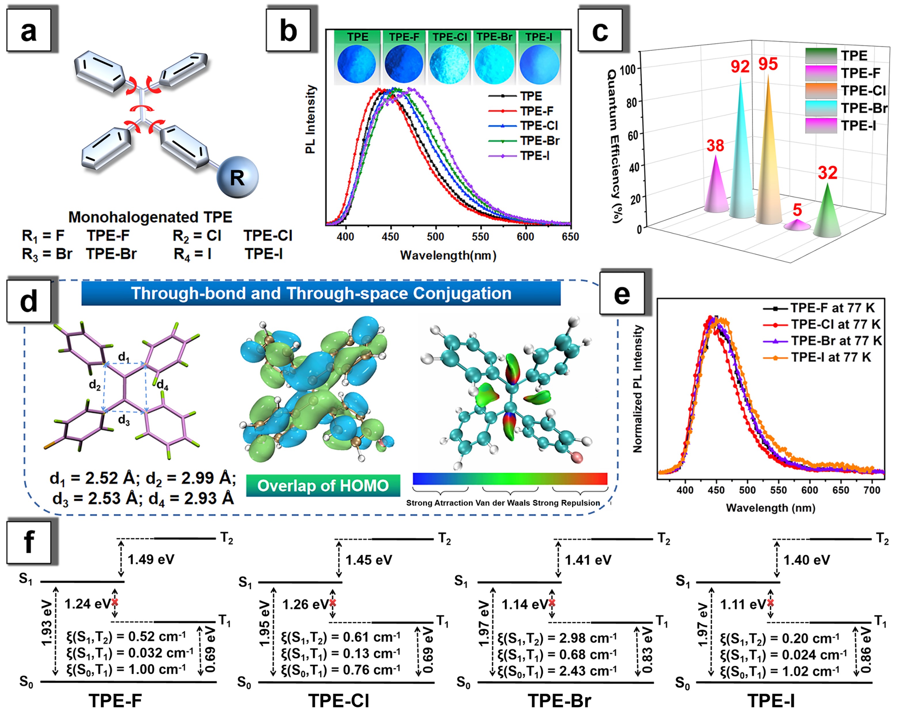 3.以卤素取代的这族四苯乙烯为例,该团队进行了大量的低温实验和充分的理论分析,证实了重原子效应在部分聚集诱导发光分子中存在一定的不适用性,并将该类现象转化为一种能大幅度提高聚集诱导发光分子固体量子效率的策略。