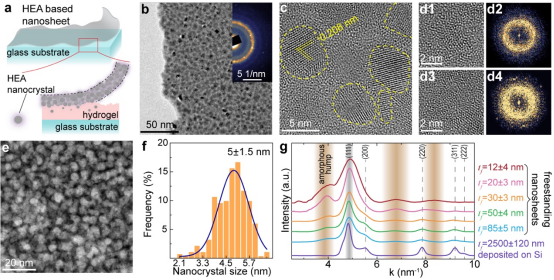 (a) Freestanding 超薄纳米薄片的形成示意图。 (b) 20 nm厚freestanding金属陶瓷纳米薄片的低倍透射电子显微镜(TEM)图像。插图显示了相应的选定区域衍射图案(SADP)。 (c) 20 nm厚freestanding金属陶瓷纳米片的高分辨率 TEM (HRTEM) 图像。纳米晶体由黄色虚线圆圈突出显示。 (d1-d4) 中包含各种有序度的非晶区域的局部 HRTEM 图像和相应的快速傅里叶变换 (FFT) 图像。 (e) 20 nm 厚 freestanding 金属陶瓷纳米片的高角度环形暗场扫描 TEM (HAADF-STEM) 图像,显示纳米晶相 (亮区) 和非晶相 (暗区)。 (f) 纳米晶体的尺寸分布。 (g) 与沉积在 Si 上的单相面心立方 (FCC) FeCoNiCrCu 薄膜相比,具有不同厚度的freestanding金属陶瓷的衍射图案的径向积分强度。索引的 FCC 晶体学取向和无定形“驼峰”分别由虚线和色带表示。