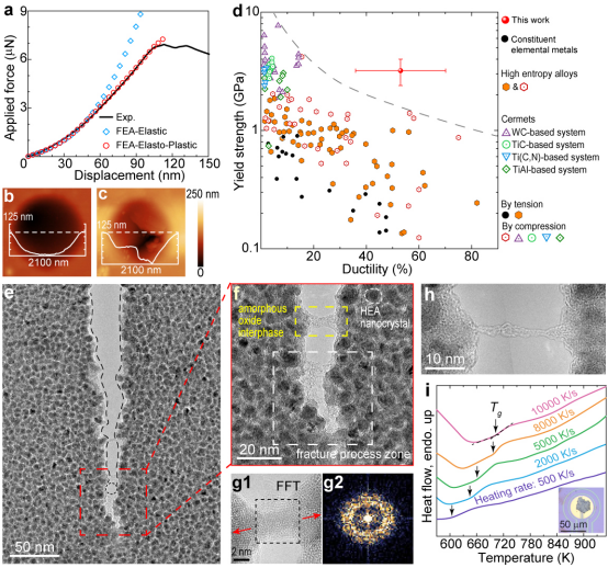(a) 20 nm厚金属陶瓷纳米片在原子力显微镜 (AFM) 压痕下实验下的力-位移曲线与有限元模拟 (FEA) 的比较。 (b-c) Freestanding金属陶瓷纳米薄片在压痕实验前 (b) 和断裂后 (c) 的 AFM 扫描图像。 (d) 与其他相关金属和金属陶瓷相比,此高熵合金 (HEA) 衍生金属陶瓷的屈服强度与延展性对比图。 e) 20 nm 厚freestanding金属陶瓷纳米薄片中被阻碍的裂纹的 TEM 图像。 (f) 断裂过程区 (fracture process zone) 放大图,如(e)中红框所示。 (g1-g2) 高度变形的界面处的非晶陶瓷相的 HRTEM 图像和相应的快速傅立叶转换 (FFT) 图像。 (h) 被拉伸至约 500% 的非晶陶瓷界面的 HRTEM 图像。请注意,此图像是两个 HRTEM 图像的拼接。 (i) 在不同加热速率下获得的 20 nm 厚freestanding金属陶瓷纳米片的闪光差示扫描量热仪 (F-DSC) 曲线。插图显示了测试前芯片传感器上纳米片样品的照片。