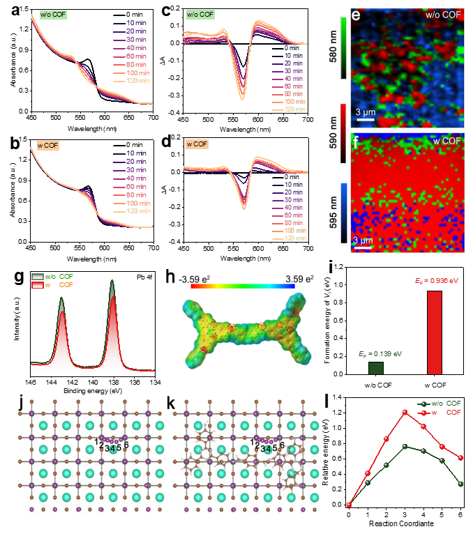 图2. (a, c) CsPbIBr2和(b, d) COF-CsPbIBr2 钙钛矿薄膜在模拟太阳光(AM1.5G, 100 mW cm-2) 持续光照120 min前后钙钛矿薄膜紫外可见吸收光谱和相对初始光谱吸收强度变化图;(e-f) COF处理前后CsPbIBr2钙钛矿薄膜的PL成像;(g) 钙钛矿薄膜的Pb 4f- XPS谱图;(h) COF重复单元的静电势分布;(i) 碘空位形成能;(j-l) 理论计算模拟COF处理前后CsPbIBr2钙钛矿中碘离子的迁移路径及在对应位点的活化能。