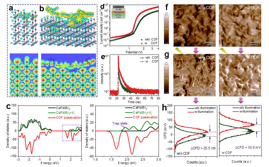 图3. (a) CsPbIBr2钙钛矿存在碘空位和(b) 被COF钝化的电荷密度分布,其中黄色和青色分别表示电子累积和缺失;(c) CsPbIBr2钙钛矿产生碘空位时,引入COF前后在最低导带附近对应的DOS曲线和局部放大图;(d) 纯电子器件的暗态J-V曲线;(e) CsPbIBr2和COF-CsPbIBr2 钙钛矿薄膜的TRPL光谱;(f-h) COF钝化前后FTO/c-TiO2/CsPbIBr2钙钛矿薄膜在光照前后对应的KPFM和电势分布。