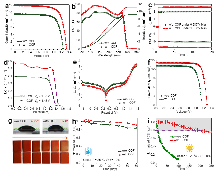图4. (a) CsPbIBr2和COF-CsPbIBr2 钙钛矿电池器件的 J-V曲线;(b) EQE谱图;(c) 稳态输出曲线;(d) 暗态模特-肖特基曲线;(e) 暗态J-V曲线;(f) CsPbI2Br和COF-CsPbI2Br 钙钛矿电池器件的 J-V曲线;(g) 接触角照片和持续光照时所对应的钙钛矿薄膜照片;(h) T = 25 °C和RH = 10%的大气环境下,未封装的CsPbIBr2和COF-CsPbIBr2钙钛矿电池器件的长期稳定性;(i) 光稳定性。