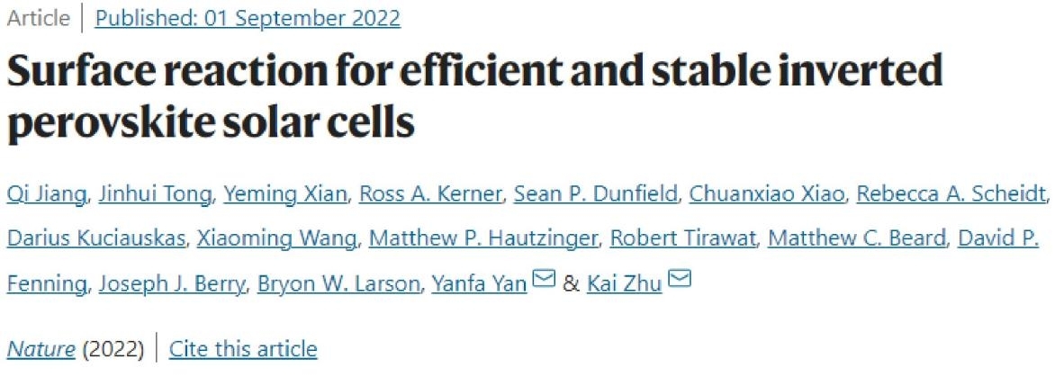 文章链接:Surface reaction for efficient and stable inverted perovskite solar cells. Nature (2022)