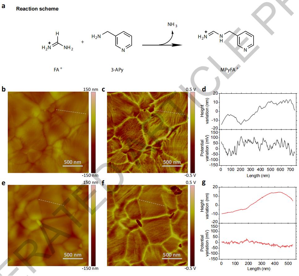 通过加入3-AP分子可以有效降低钙钛矿表面的粗糙度,降低I离子空位的形成能,形成n型掺杂,实现表面能带弯曲,提升对电子的抽取能力。