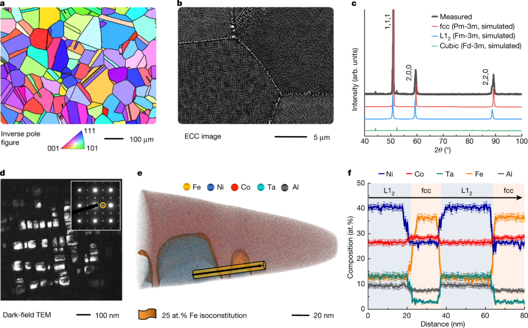 图1 M-MCA(中等粒度多组元合金)的显微结构和化学成份;a. EBSD反极图显示出fcc基体的等轴晶粒。黑线突出高角度晶界/孪晶边界;b. 晶粒内部高密度均匀分布的L12颗粒和晶界处非均匀颗粒的ECC图像;c,实测和模拟的XRD图,显示出相结构;d,用(011)超晶格点获得的L12粒子的中心DF-TEM图像;e,典型APT针尖三维重建图,显示立方状L12颗粒嵌入fcc基体。L12-fcc界面含有25 at%的Fe成。f,沿e中圆柱体区域计算的一维成分剖面(由黑色箭头标记),显示了几个界面的成分变化。误差条为计数统计数据的标准偏差[1]。