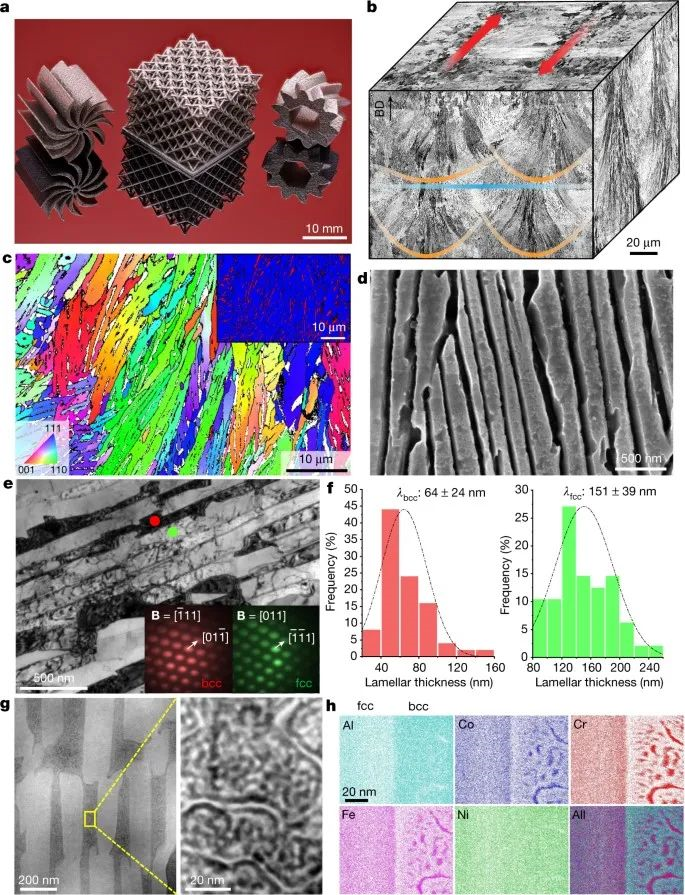 图2 增材制造的AlCoCrFeNi2.1 EHEA的微观结构;a、从左至右为打印的散热风扇、八隅体格子(支柱尺寸约300 μm)、齿轮;b、AlCoCrFeNi2.1 EHEA打印后的三维重建光学显微图,层间边界、熔池边界和激光扫描轨迹分别用蓝色线、橙色线和红色箭头表示。构建方向(BD)是垂直的;c,AM AlCoCrFeNi2.1 EHEA的横截面EBSD IPF图,显示了放大的局部区域,在该区域,相邻的纳米层状共晶区域呈现出不同的晶体取向;d,纳米层状结构的二次电子显微图;e, bcc和fcc纳米层的明场TEM图像(分别用红点和绿点表示),插图显示了分别倾斜于晶带轴(B) [11]bcc和[011]fcc的PED图;f、AM AlCoCrFeNi2.1 EHEA中bcc(左)和fcc(右)片层厚度的分布;g, HAADF-STEM图像显示bcc片层内的调制纳米结构;h、100×78×5 nm3范围内fcc/bcc界面元素分布的APT图。bcc片层内的化学波动表现为纳米级的富Ni-Al区和富Co-Cr-Fe区 [2]。