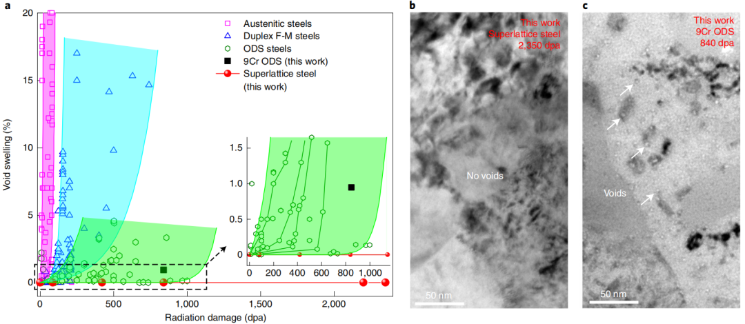 图3 含高密度Ni(Al,Fe) NPs的超晶格钢具有优良的辐照耐受性。b和c的比较表明,超晶格钢的抗空隙膨胀性能比9Cr ODS钢强得多;a. 与传统奥氏体钢、铁素体马氏体钢和ODS钢相比,超晶格钢中的空隙膨胀现象更为明显,插图(虚线矩形框的放大视图)显示,与几种典型的ODS钢相比,超晶格钢呈现零空洞膨胀;b. 500℃时,超晶格钢在2350 dpa后条件下辐照损伤后的TEM显微图,未见空洞产生;c. 500℃时,9Cr ODS钢在840 dpa后条件下辐照损伤后的TEM显微图,观察到大量空洞 [3] 。