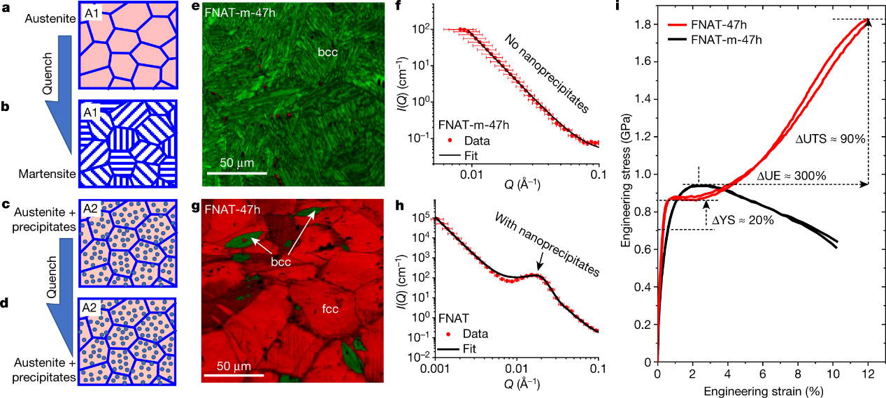 图4 FNAT-m-47h和FNAT-47h合金的组织和拉伸性能。a-d,显示在高温下没有沉淀的奥氏体示意图(A1;a); 淬火至室温(A1;b);奥氏体+在高温下析出相(A2;c);淬火至室温(A2;d)。e,显示FNAT-m-47h水淬后完全马氏体组织的EBSD图像质量和相图。f,散射强度与反波长的SANS图显示在FNAT-m-47h中没有纳米沉淀物的证据;误差条表示1个标准差。g, EBSD图像质量和相图显示水淬后FNAT-47h中等轴fcc(红色)和透镜状bcc(绿色)区域。h, SANS图显示与FNAT-47h的纳米沉淀相对应的驼峰;误差条表示1个标准差。i,室温拉伸试验FNAT-m-47h和FNAT-47h合金的工程应力-应变曲线实例;ΔUTS、ΔUE和ΔYS分别代表极限抗拉强度(UTS)、均匀伸长(UE)和屈服强度(YS)的增加 [4] 。