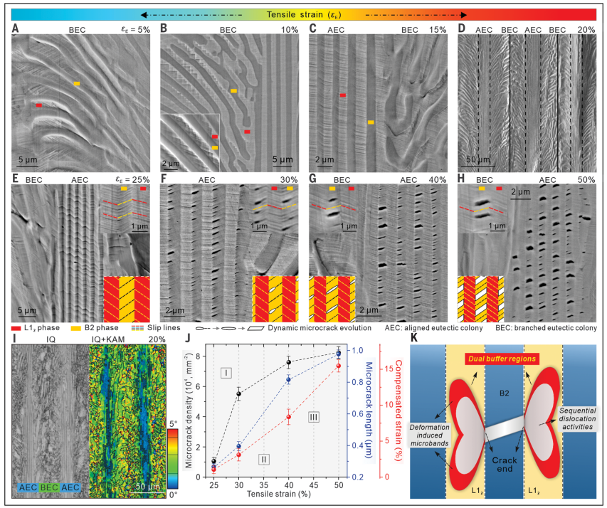 图5 (A-D)SEM背散射电子图像揭示了随着拉伸变形的进行,发生了从软BEC区域到硬AEC区域第次激活的变形行为。(E-H)SEM背散射电子图像表明随着变形的进行,鱼脊骨梯度结构动态的微裂纹演变和优异的多级裂纹缓冲现象,因而诱导了异常稳定的高密度微裂纹,而过早断裂失效。(J)微裂纹长度、微裂纹密度和补偿应变在AEC区域中的演化。I -III阶段对应的拉伸应变分别为25 – 30%、30 – 40%和40 – 50%。共晶鱼骨高熵材料的整体延伸率为~50%,而微裂纹在应变25~30%就已经大量萌生,但却没有造成断裂失效。(K)多级裂纹缓冲原理图 [5]。
