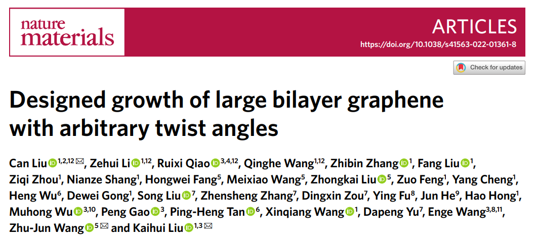 中国人民大学刘灿研究员、北京大学李泽晖特聘副研究员、南京航空航天大学乔瑞喜特聘副研究员以及北京大学王卿赫(在读)博士为论文共同第一作者。相关研究文章以“Designed growth of large bilayer graphene with arbitrary twist angles”为题发表在Nature Materials上。