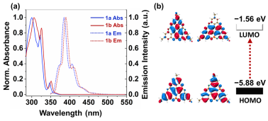 图4. 1a和1b的(a)溶液吸收、发射光谱与(b)TD-DFT计算的简并前线轨道