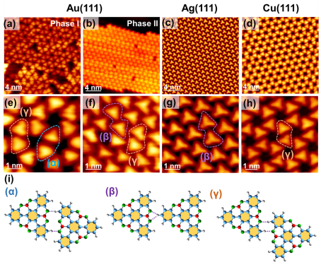 图5.(a–h)1a在不同基底上组装体的STM图;(i)基于不同组装结构的二聚体模型