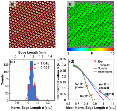 为了定量分析二维聚集体的有序度与结构特征,作者以Ag(111)基底上每个分子的质心为节点,对其组装形貌做了MST分析(the minimum spanning tree,图6a)。由MST分析结果所得的Voronoi分布将组装体划分为多个规则的六边形晶胞,证明了分子在基底上的排列高度有序(图6b)。与此同时,统计结果表明MST图中平均边缘长度(绿线)为~1.045,标准偏差为~0.021(图6c)。通过对比不同种类标准晶格的拟合曲线可得分子1a呈现出三角晶格(triangular)的二维组装结构(图6d)。同样地,通过MST分析可得1a在Au(111)表面phase II中的晶格类型同样为三角晶格,而在Cu(111)表面和Au(111)表面phase I中的晶格类型则为蜂窝状晶格(honeycomb)。