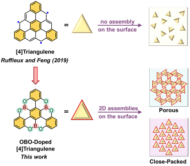 图1. 已有的[4]三角烯和本文报道的硼氧杂[4]三角烯及其在不同基底上的组装形貌示意图