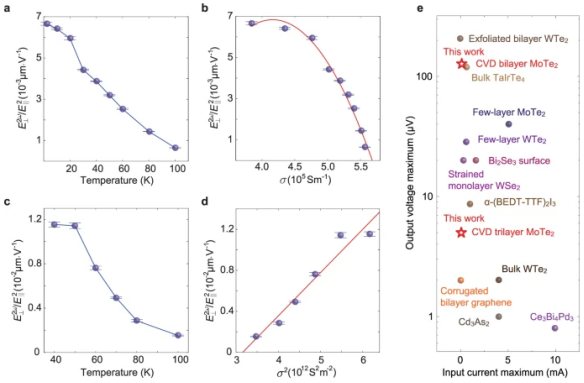 - 通过霍尔器件测试发现,CVD法制备的双层MoTe2在较小的电流输入条件下(97 μA)表现出了高达125 μV的二阶电压输出,其指标在现有二维材料中处于最强行列。