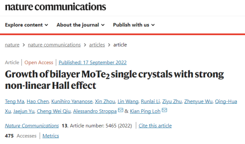 2022年9月17日,相关研究成果以“具有强非线性霍尔效应的双层MoTe2的生长”(Growth of bilayer MoTe2 single crystals with strong non-linear Hall effect)为题,在线发表于《自然·通讯》(Nature Communications)。香港理工大学研究助理教授马腾、新加坡国立大学博士后陈浩、首尔国立大学Kunihiro Yananose为本文的共同第一作者。新加坡国立大学罗健平教授和意大利拉奎拉大学Alessandro Stroppa为本文的通讯作者。研究工作得到新加坡国家研究基金、香港理工大学等财政支持。
