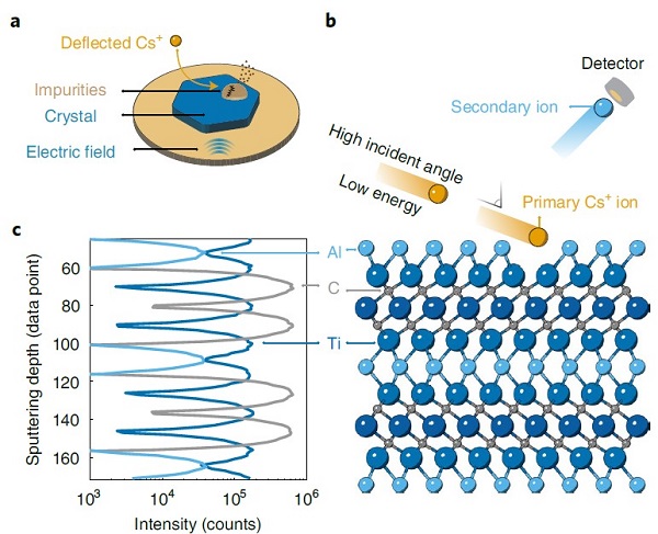 特别是对于轻元素来说,目前还没有出现适合检测、形态分析和量化的表征技术。而作为构成MXenes的表面端基,其对MXene的性质和应用会产生重大影响,因此对轻元素进行详细研究意义重大。在MXenes的研究中,人们会使用二次离子质谱法(SIMS)对材料进行表征。在这一过程中,与样品表面非弹性相互作用的初级离子首先轰击样品,并溅射出二次离子,收集二次离子并根据其质量电荷比进行分离和检测。目前,SIMS可在微米/亚微米深度水平实现元素分布分析,但SIMS对MXenees的原子逐层分析会受到混合效应的限制:用初级离子轰击样品后,表面下剩余的原子从它们的固定位置被击落到样品的较深区域。最新的SIMS技术发展显示,人们能够将初级离子的冲击能从降至0.1 keV,有利于降低混合效应并提高了深度分辨率。这一改进已经在数种二维材料(如石墨烯等)中得到了阐释和验证,,但这些材料的横向尺寸都在平方厘米级水平,相较而言,MAX和 MXene颗粒的横向尺寸在数十到数百个平方微米水平。