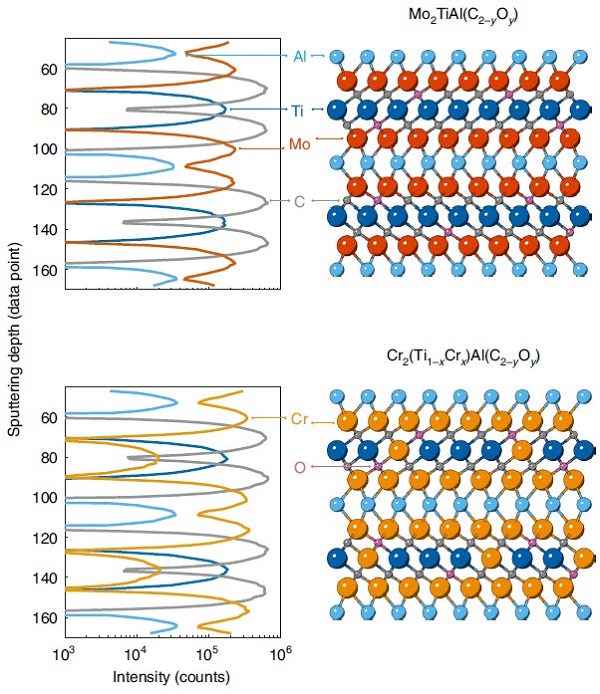 图4. Mo2TiAlC2 (上)和 Cr2TiAlC2 (下) MAX样品的深度剖析 。© 2022 Springer Nature Limited