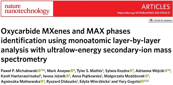 近期,德雷塞尔大学的Yury Gogotsi和波兰微电子与光子研究所-Łukasiewicz Research Network的Paweł P. Michałowski(共同通讯作者)等人使用超低能二次离子质谱法,成功实现了对MXenes单粒子及其对应MAX相的原子级分辨率深度剖析。通过这一方法,研究直接检测到了碳亚晶格中的氧,从而揭示了碳氧化物(oxycarbide)MXenes的存在。不仅如此,研究还确定了相邻表面终端层的组成及它们之间的相互作用。对金属亚晶格的分析则显示,Mo2TiAlC2 MAX具有完美的面外有序度,而Cr2TiAlC2 MAX的内部过渡金属层中Cr和Ti之间的出现了交错混合的情况。该结果展示了研究所开发的二次离子质谱技术具有以单原子层精度探测层状和二维材料成分的潜在能力。该文通讯作者Paweł P. Michałowski同时也是第一作者,文章以题为“Oxycarbide MXenes and MAX phases identification using monoatomic layer-by-layer analysis with ultralow-energy secondary-ion mass spectrometry”发布在国际著名期刊Nature Nanotechnology上。