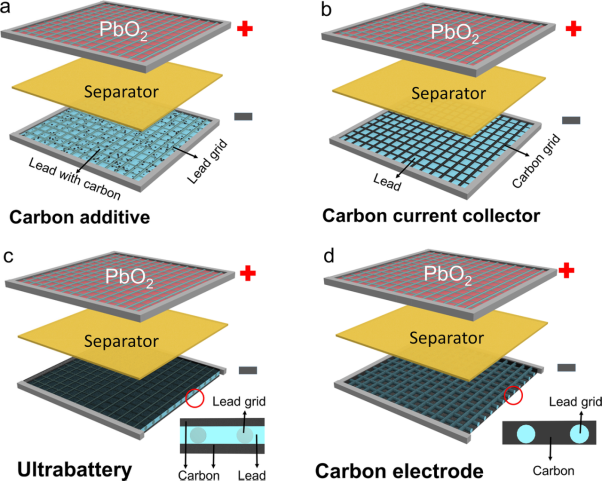 Gaston Planté在1859年开发的铅酸电池成为了目前应用最为广泛的电池体系之一。该铅酸电池的储能应用从最初的照明到电动汽车再到不间断电源,得到了不断的发展。然而,铅酸电池在高倍率部分荷电状态(HRPSoC)下通常面临着严重的负极硫酸盐化问题。为了解决这一问题,在负极中引入部分或全部碳材料能有效地降低硫酸盐的浓度,并提高电池的循环寿命和降低电池的制造成本。根据负极材料碳含量及结构的不同,铅-碳电池的负极能够被分类为碳作为添加剂(图5a),碳作为集流体(图5b),混合电容/电池(图5c),以及碳作为负极(图5d)。
