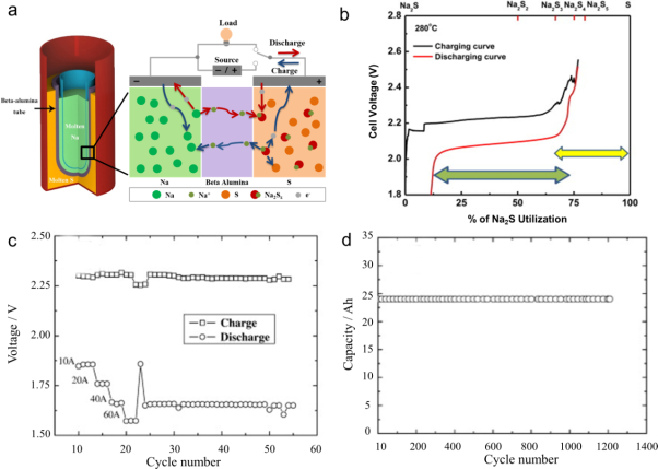 作为熔融盐电池中的传统钠-硫电池具有较高的能量密度、长循环寿命和高库伦效率,在固定储能和车辆动力应用方面提供了广阔的前景(图6)。然而,高的工作温度却阻碍了钠-硫电池的进一步广泛应用。至此,在150 ℃左右工作的中温钠-硫电池因较低的工作温度有助于抑制电池内部电极的腐蚀性,已经开始备受关注。然而,中温钠-硫电池的最大问题是多硫化物的溶解和穿梭效应,导致电池容量快速衰减。