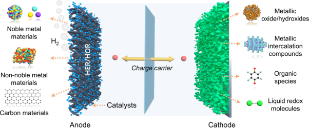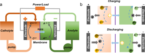 自1974年以来,Thaller等人发明的氧化还原液流电池一直被视为中型和大型储能应用中最实用的储能技术之一。与通过电极存储能量的金属离子电池不同,氧化还原液流电池凭借其自身独特的结构,能够把能量存储在装满电解液的储存罐中(图8)。一般来说,溶解在支持电解液中的正极和负极氧化还原物质被选择性膜隔开。在电池循环过程中,正极液和负极液通过泵和管路输送到电池内部,并流经多孔电极进行各自的氧化还原反应。论文对电池电极、隔膜、氧化还原物质和各种有前景的新型氧化还原液流电池的研究进展进行了详细地总结与讨论。尽管研究人员对液流电池进行了大量的研究工作,但其电池制造成本仍远远高于电池应用于电网式储能的目标(<100美元/kWh)。
