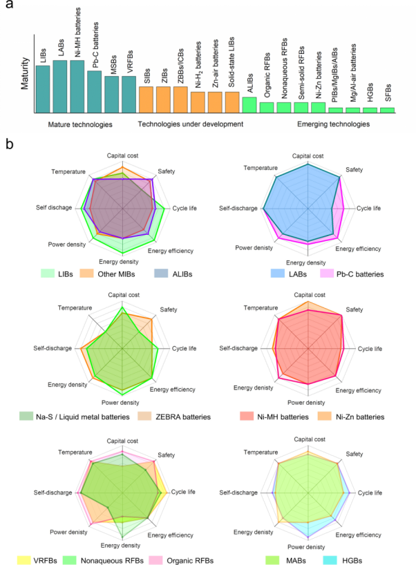 图11. 不同大规模电网式储能电池的成熟度与性能参数总结。