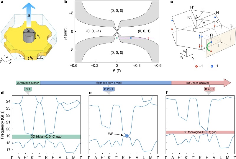 二维霍尔丹模型(2D Haldane)模型一直作为陈绝缘体(Chern insulator)相的原型,确立了能带拓扑的概念作为材料的固有特性。霍尔丹模型描述了陈绝缘体如何通过晶体中的时间反演对称性破坏而产生,指导了许多2D拓扑材料的理论和实验发现,包括陈绝缘体以及量子自旋霍尔效应。同时,霍尔丹模型背后的思想已经从凝聚态系统转化为经典波系统,从而产生了拓扑光子学和拓扑声学领域。这些经典的波实现,称为光子或声学拓扑绝缘体,表现出拓扑非平凡的带结构和拓扑边缘状态,但缺乏某些特征,如量化霍尔电导。近十年来,本征能带拓扑的概念已扩展到众多三维(3D)拓扑材料。然而,陈绝缘体本身在实验实现方面明显落后。仅在2013年才使用真正的晶体材料中的2D陈绝缘体,使用3D强拓扑绝缘体薄膜。目前,还没有实现3D陈绝缘体。3D陈绝缘体的特征在于由三个Chern数组成的向量C =(Cx, Cy, Cz)组成的Chern向量,类似于3D量子霍尔效应。此外,3D陈绝缘体通过一个过程表现出到Weyl半金属的相变,由此一个非平凡的Chern向量从一对带相反电荷的Weyl点(WPs)中出现,但这种拓扑相变从未在实验中观察到。
