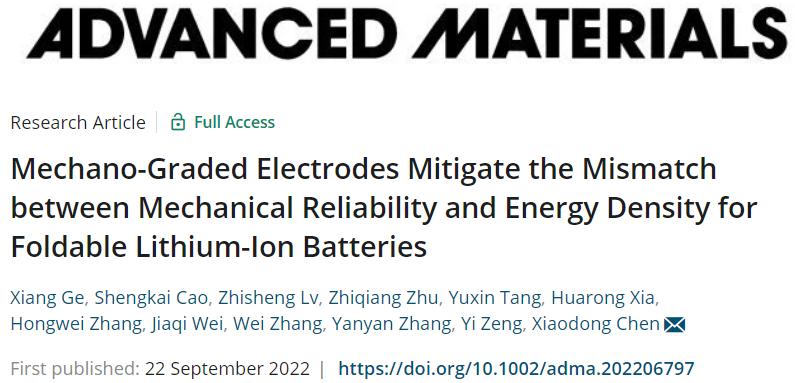 原文详情:Xiang Ge, Shengkai Cao, Zhisheng Lv, Zhiqiang Zhu, Yuxin Tang, Huarong Xia, Hongwei Zhang, Jiaqi Wei, Wei Zhang, Yanyan Zhang, Yi Zeng, Xiaodong Chen*, Mechano-Graded Electrodes Mitigate the Mismatch between Mechanical Reliability and Energy Density for Foldable Lithium-Ion Batteries, https://doi.org/10.1002/adma.202206797.