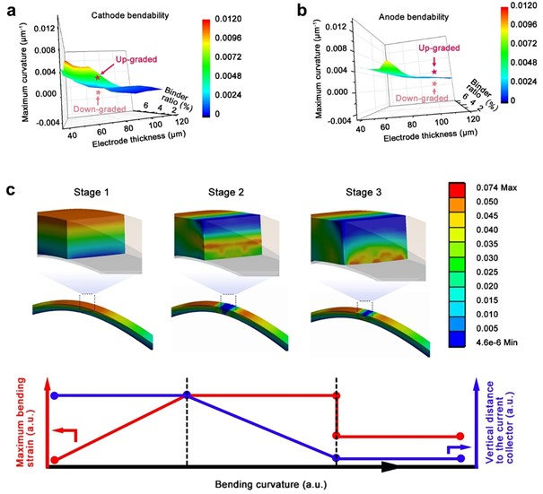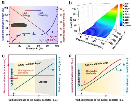 (a)传统均匀电极的机械柔性和能量密度之间的不匹配,这种不匹配配在厚电极中尤为明显;(b)不同曲率半径下的应变分布分析,弯曲应变沿电极涂层底层至顶层呈梯度递增分布;(c)均匀电极和(d)力学梯度递增电极的最大承受应变分布以及相应的弯曲应变分布。©Year The Authors