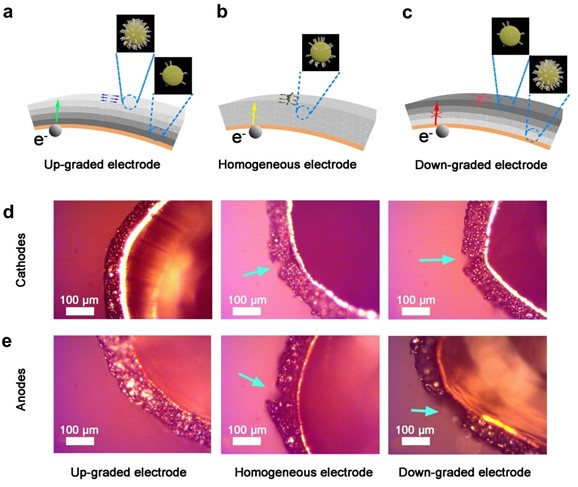 (a-c)力学梯度递增,均匀,力学梯度递减电极示意图;(d,e)弯折条件下,力学梯度和均匀电极的光学显微镜照片,(d)正极和(e)负极厚度分别为70±5 μm和105±10 μm,正极和负极的曲率半径分别为400 μm和600 μm。©Year The Authors