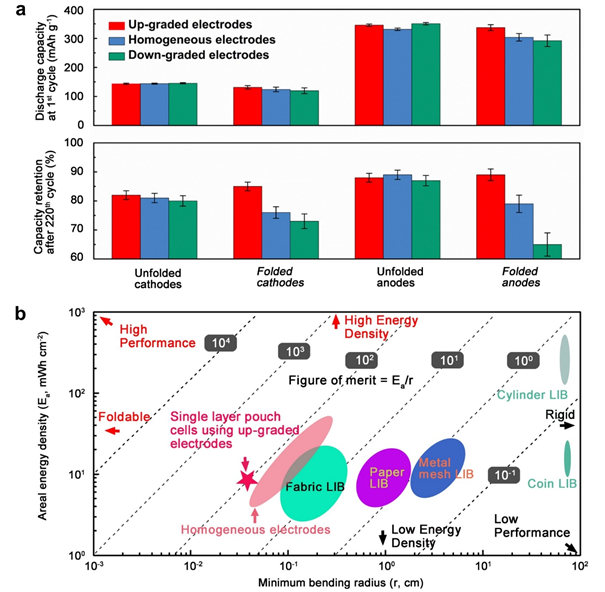 (a,b)三种电极折叠后的电化学稳定性。(a)对于首次循环的放电容量,力学梯度递增正极和负极的放电容量都略高于力学递减电极和均匀电极,经过220次循环后,力学梯度递增正极的容量保持率也均高于力学递减电极和均匀电极;(b)基于真实能量密度(Ea)与弯曲半径(r)的品质因素Ea/r可用来标准化比较柔性LIBs的性能,对比不同厚度的各种电池体系,FOM越高表示综合性能越好。©Year The Authors