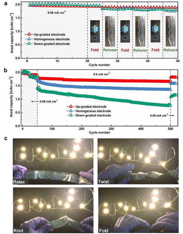 (a)软包全电池(~60 mAh)在重复折叠和电化学循环下的稳定性(0.06mA cm−2);(b)520圈循环过程的容量变化,前50圈循环的性能如图(a)所示,第50圈后,以释放状态和0.6 mA cm−2的电流密度循环,经过第500圈循环后,电流密度降低到0.06 mA cm−2;(c)软包电池在扭转、折叠和打结条件下仍可为并联led提供稳定的电能。