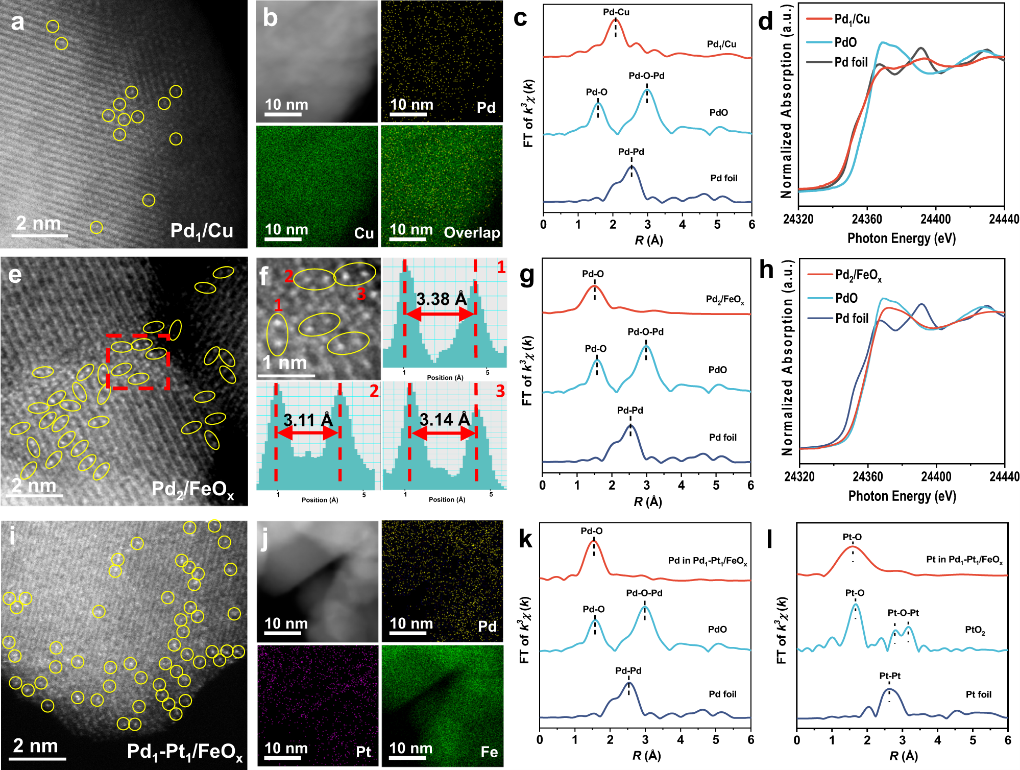 (i-l) Pd1-Pt1/FeOx的AC HAADF-STEM图像、元素映射和Pd K-edge FT-EXAFS光谱;