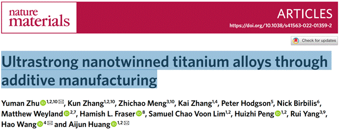 最近,来自澳大利亚蒙纳士大学增材制造中心的黄爱军教授、朱玉满高级研究员联合上海理工大学、中科院金属所、澳大利亚国立大学、澳大利亚迪肯大学以及美国俄亥俄州立大学的相关知名学者,揭示了增材制造可以利用热循环和快速凝固来创造可能直接用于服役的超强和热稳定的钛合金。以一种商用钛合金为例,经过简单的热处理后,其延伸率和抗拉强度均超过了1600 MPa。这种优异的性能是由于形成了在传统加工的钛合金中罕见地致密、稳定的内部纳米孪晶沉淀物。这些纳米孪晶沉淀物来源于具有螺旋特征的高密度位错,在增材制造过程中自动形成。该工作为制造具有独特微结构和优异性能的结构材料提供了广阔的应用前景。相关成果以“Ultrastrong nanotwinned titanium alloys through additive manufacturing”为题发表在国际材料顶级期刊Nature Materials期刊上。