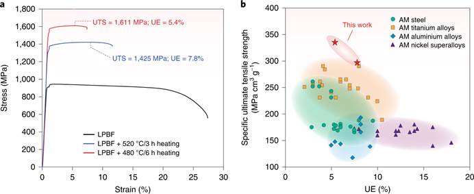 图1 通过LPBF(激光粉末床熔合)制备及热处理后的商用β – C钛合金拉伸的力学响应;a,在480°C/6 h和520°C/3 h下,3D打印样品和热处理后样品的工程应力-应变曲线。b, LPBF β-C合金热处理后比强度与均匀伸长率(UE)的相关性,并与AM制备的其他高强度钛合金、钢、铝和镍基高温合金进行比较。