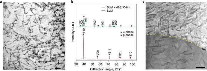 图2 LPBF成型及热处理后β – c钛合金的显微组织;a, BF TEM图像显示了微观组织中密集的位错。该图像在{10}<110>β双束条件下拍摄。 b, XRD谱证实了在制备和热处理时微观组织中存在的相。c, HAADF-STEM图像显示热处理组织中密集的α-沉淀(480°c /6 h)。图中黄色虚线为β基质中缺少典型的GB α相的GB的迹线。电子束平行于<100>β晶带轴。