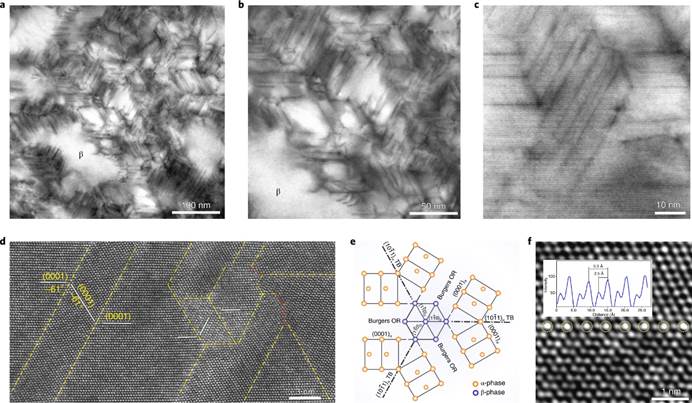 图3 热处理(480℃/6 h)后,纳米孪晶α-在LPBF组织中析出。a – c, BF-STEM图像显示α-析出相中存在沿着三个方向的高密度片层。观察方向平行于<111>β或{110}α; d.自局部区域的原子尺度HAADF -STEM图像显示三个α-变体具有{101}α-孪晶关系。TBs用黄色虚线表示,而每粒中的基面用白线表示。孪晶的某些边缘和{103}α TB用红色虚线表示。e,表示β-相和{101}α α-孪晶变体之间的Burgers OR的示意图(用它们的晶胞表示)。透射束方向为<111>β或{110}α。f,原子分辨率HAADF-STEM图像显示{101}α TB中的溶质周期性偏析。图像中的每个亮点表示一个富含Mo/ Zr的原子柱。插图中的原子柱强度分布图显示了TB上两个相邻亮点(5.5 Å)与亮点及其左侧相对暗点(2.5 Å)之间的距离。