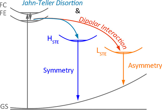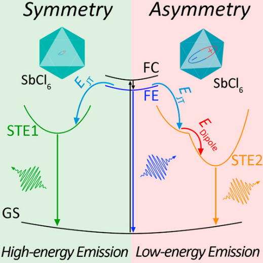 由于自陷态激子(STEs)宽谱发光中存在多种荧光组分,因此常表现出不对称的峰形。但由于各个荧光组分高度重叠,难以独立区分各个组分的分布以及来源。由于每个荧光路径都有其对应的衰减特征寿命,作者提出使用特征衰减寿命随波长的分布来确定该荧光组分的真实分布情况。如图4所示,文中具体使用了波长扫描衰减曲线mapping的方式(即逐波长采集荧光光谱的衰减曲线)来获得寿命常数随波长的分布。在三个材料体系荧光光谱的高能端均观测到相似的0.3微秒的短寿命荧光组分。这个具有短的寿命荧光组分复合自由激子(FE)荧光的特征,首次实验上证实了自由激子的存在。因此可得出结论,Sb3+掺杂钙钛矿材料的宽谱荧光来自于Sb3+掺杂中心自陷态能级。作者进一步的区分并比较了Sb3+在不同钙钛矿基质材料结构中的FEs和STEs发光的分布特点,发现相对高能量的STEs荧光(蓝、绿色)只出现在对称性的晶体环境中,而相对低量的STEs荧光(黄、红色)则普遍与非对称性的结构或振动方式相关。相比于对称性的锑氯多面体结构中不明显的偶极,非对称的结构/振动过程中存在显著的永久/瞬态偶级,因此可以推断偶极-偶极相互作用导致了自陷态激子的二次能量损失(图5)。