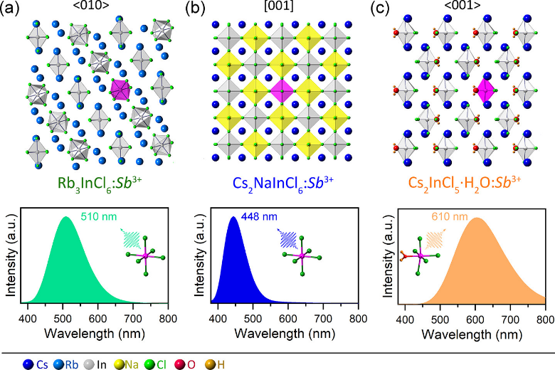 图1.晶体结构和相应光致发光的示意图,来自(a)Rb3InCl6:Sb3+,(b)Cs2NaInCl6:Sb3+和(c)Cs2InCl5·H2O:Sb3+。